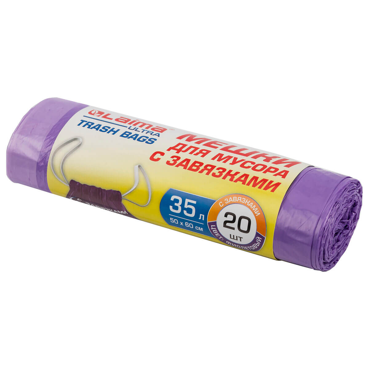 Мешки для мусора 35 л, с завязками, фиолетовые, в рулоне 20 шт., ПНД, 13 мкм, 600х500 мм, LAIMA ULTRA, 607685 в Зеленодольске
