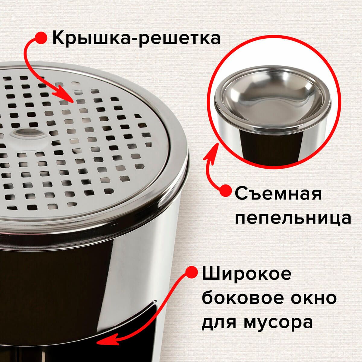 Интегрированная пепельница с крышкой предотвращает попадание горящих окурков и пепла внутрь урны, что обеспечивает безопасность и предотвращает пожары. Боковое окно добавляет удобства при выбрасывании крупных предметов.